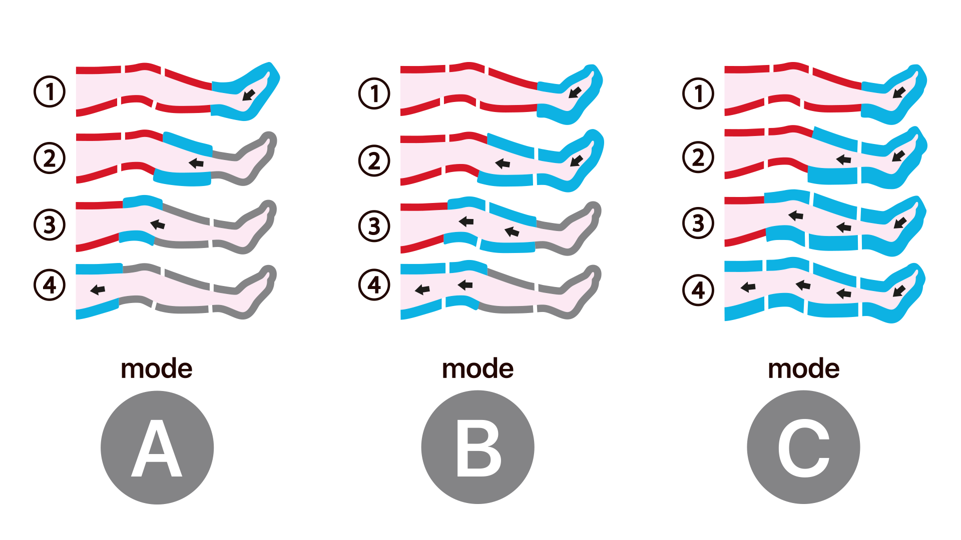 MODE B: la sequenza del programma prevede il gonfiaggio e lo sgonfiaggio di due camere per volta, per evitare il reflusso di fluidi verso il basso e rendere il trattamento efficace e molto confortevole